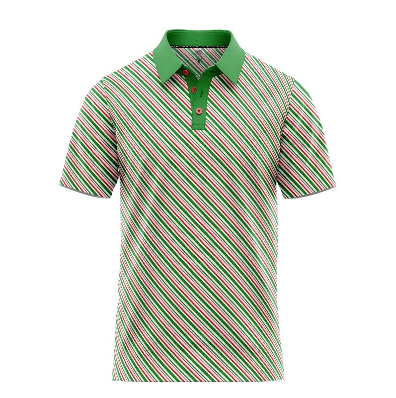 This Scale Wear Design 100% polyester candy cane polo shirt utilizes Dri-Fit technology to wick away sweat and keep you cool and dry. The moisture-wicking properties allow the shirt to dry quickly, preventing clinginess, discomfort and even some of your body odor as you sweat. The premium fabric is designed to provide a cooling effect, ideal for athletic activities or hot weather golfing. This green polo shirt with a funny candy cane pattern offers freedom of movement and breathability especially with its three button collar.